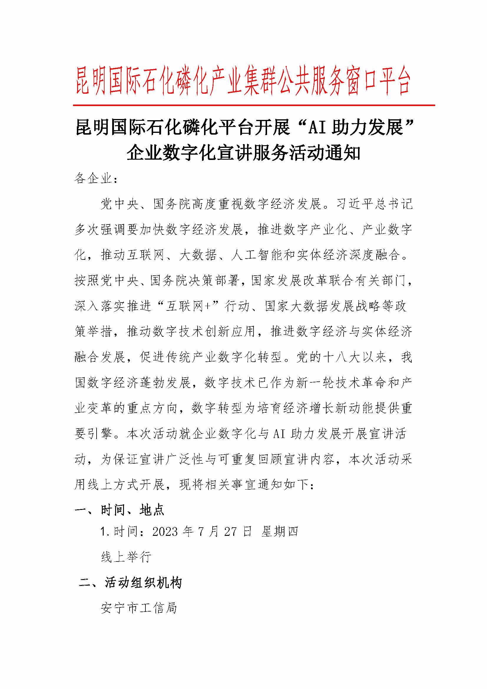 昆明國(guó)際石化磷化平臺(tái)開展“AI助力發(fā)展”企業(yè)數(shù)字化宣講服務(wù)活動(dòng)通知