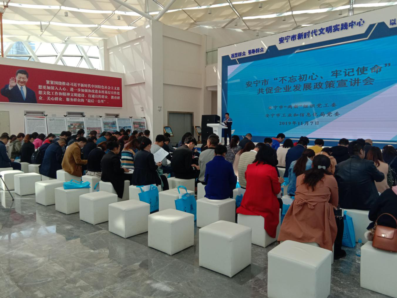 2019年11月7日 ,由安寧市“兩新”組織黨工委、安寧市工業(yè)和信息化局主辦, 昆明國際石化磷化產(chǎn)業(yè)集群公共服務(wù)窗口平臺協(xié)辦的“不忘初心、牢記使命”共促企業(yè)發(fā)展政策宣講座談會在安寧市新時(shí)代文明實(shí)踐中心小云端廳成功舉辦。安寧市域50家規(guī)上企業(yè)負(fù)責(zé)人代表、40家中小企業(yè)負(fù)責(zé)人代表、通訊三大運(yùn)營商負(fù)責(zé)人、工信局黨委所轄17家非公黨支部書記、昆明國際石化磷化產(chǎn)業(yè)集群公共服務(wù)窗口平臺負(fù)責(zé)人共100多人參加此次會議。