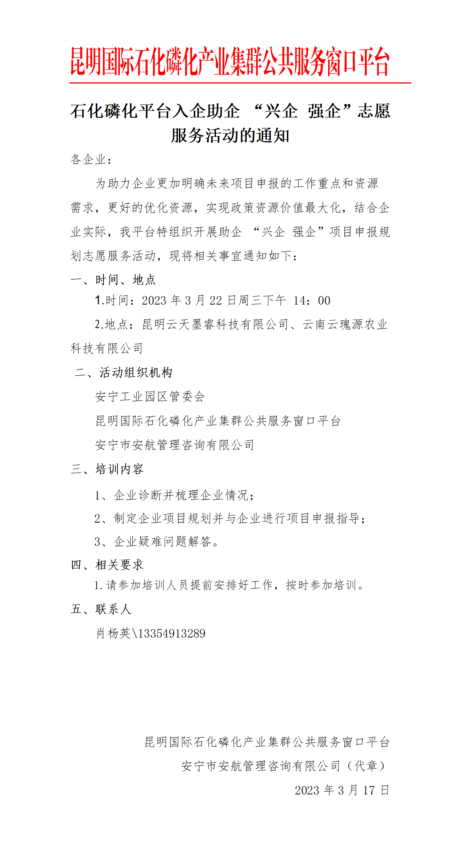 石化磷化平臺(tái)入企助企 “興企 強(qiáng)企”志愿服務(wù)活動(dòng)的通知