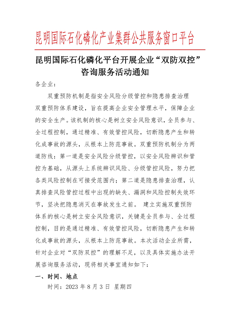 昆明國(guó)際石化磷化平臺(tái)開(kāi)展企業(yè)“雙防雙控”咨詢服務(wù)活動(dòng)通知